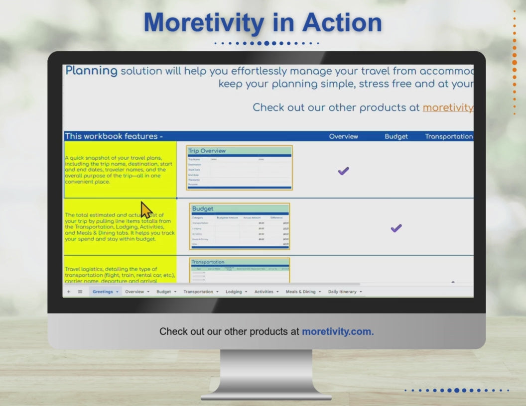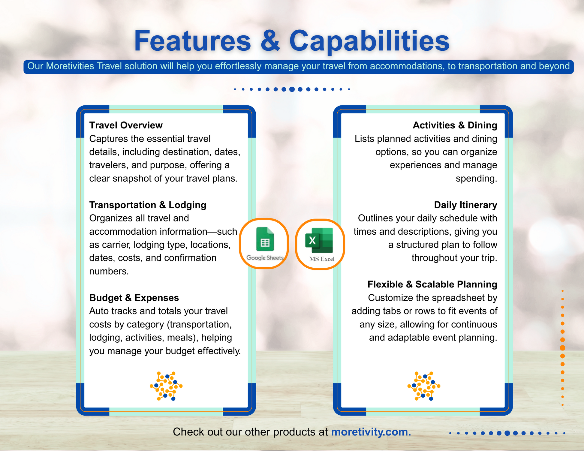 Greetings and Salutations! Welcome to Moretivity, your premier activity planning solution. Our Moretivity Travel Planning solution will help you effortlessly manage your travel from accommodations, to transportation and beyond, to keep your planning simple, stress free and at your finger tips.